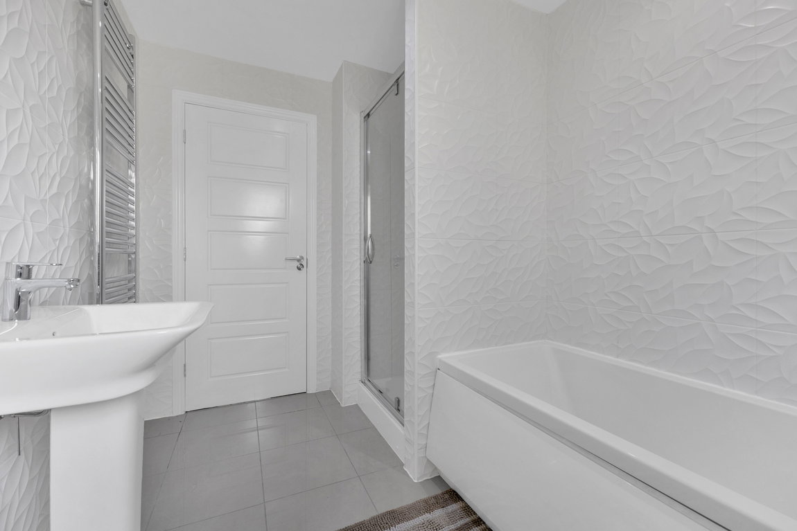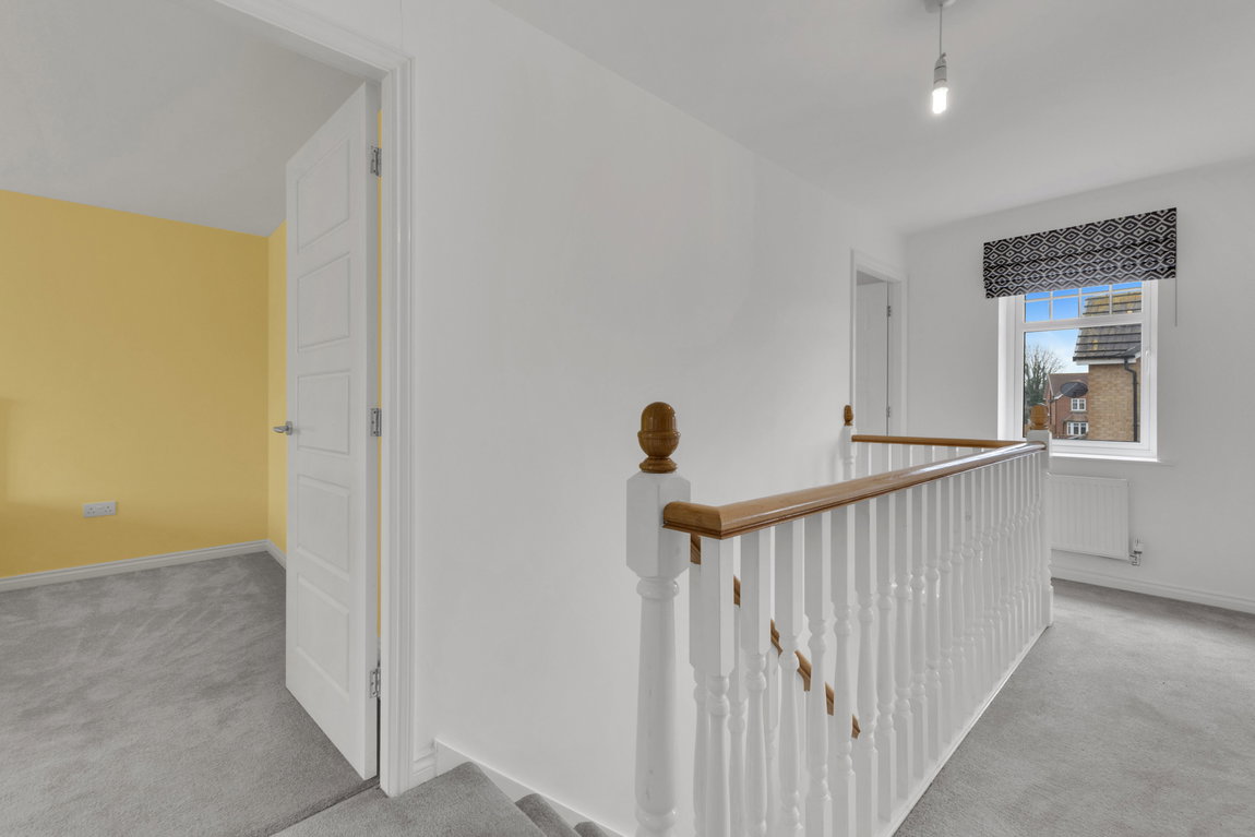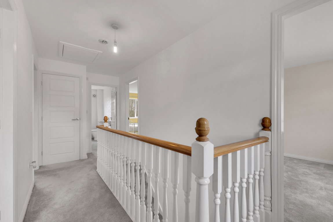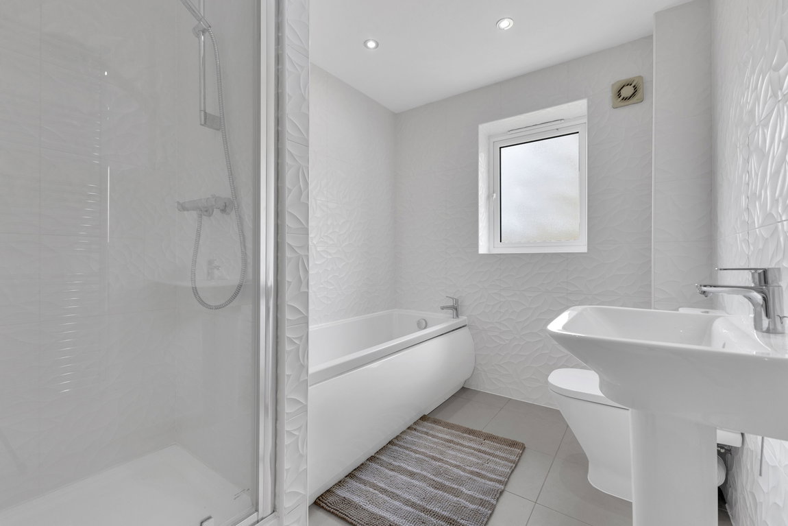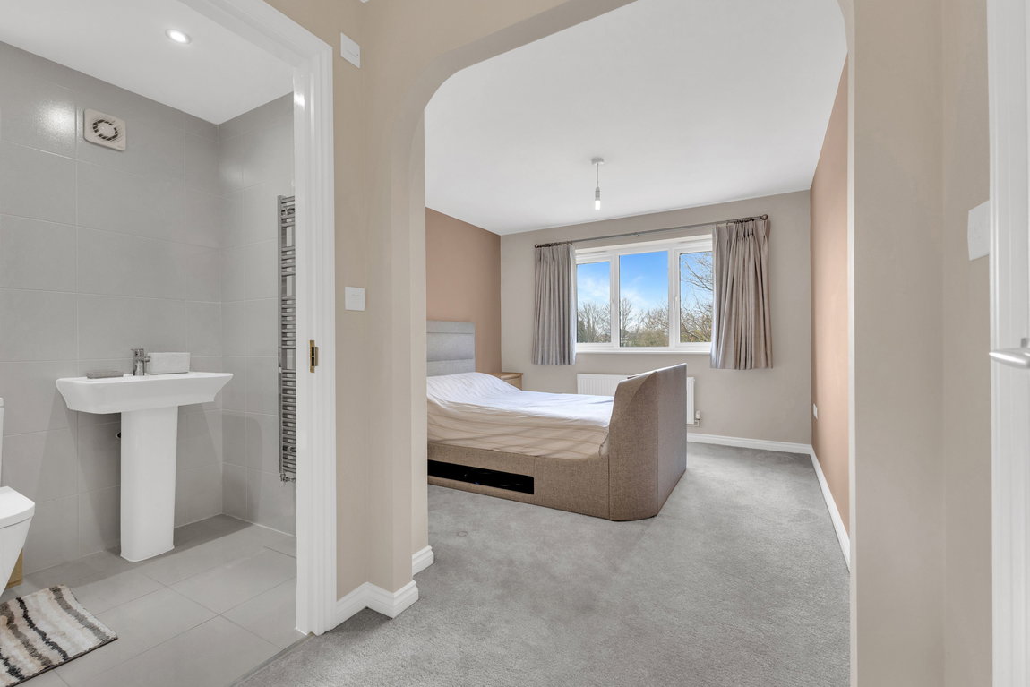 Upstairs, the main bedroom is positioned at the rear and benefits from a dressing area and en-suite shower room. There are three further double bedrooms, offering flexibility for family, guests, or home working, along with a contemporary family bathroom featuring both a bath and separate shower.