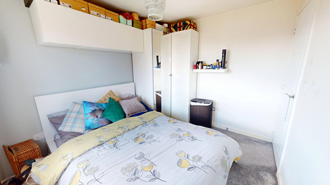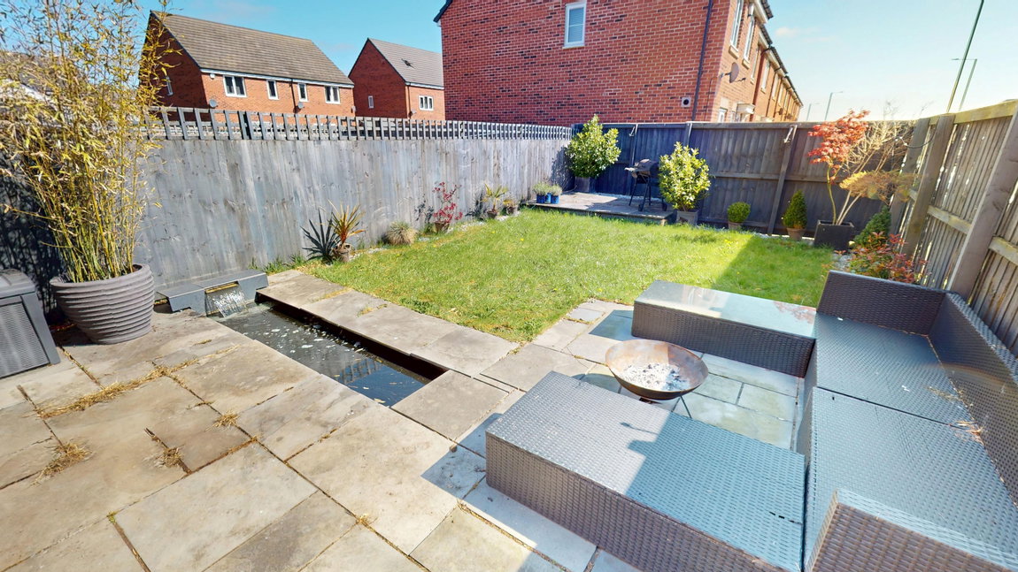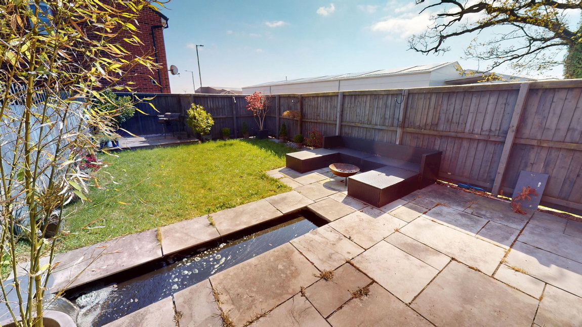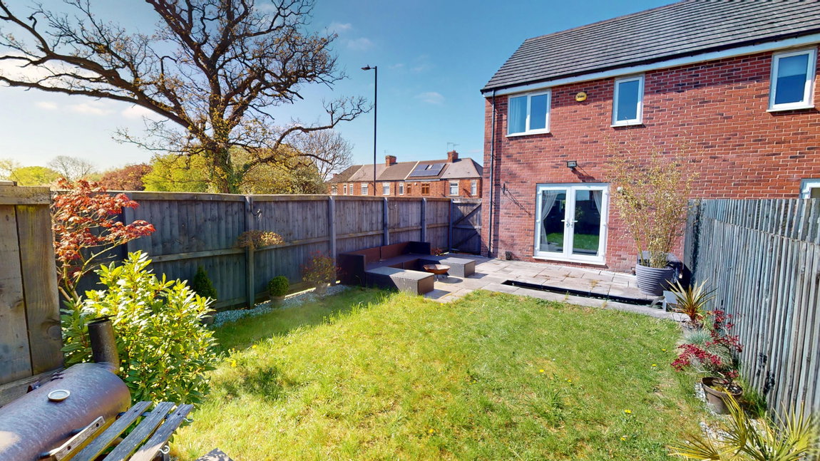 Outside, the rear garden includes a patio area and lawn, providing space for outdoor seating, play, or low-maintenance gardening. To the front, there is off-road parking for two vehicles.